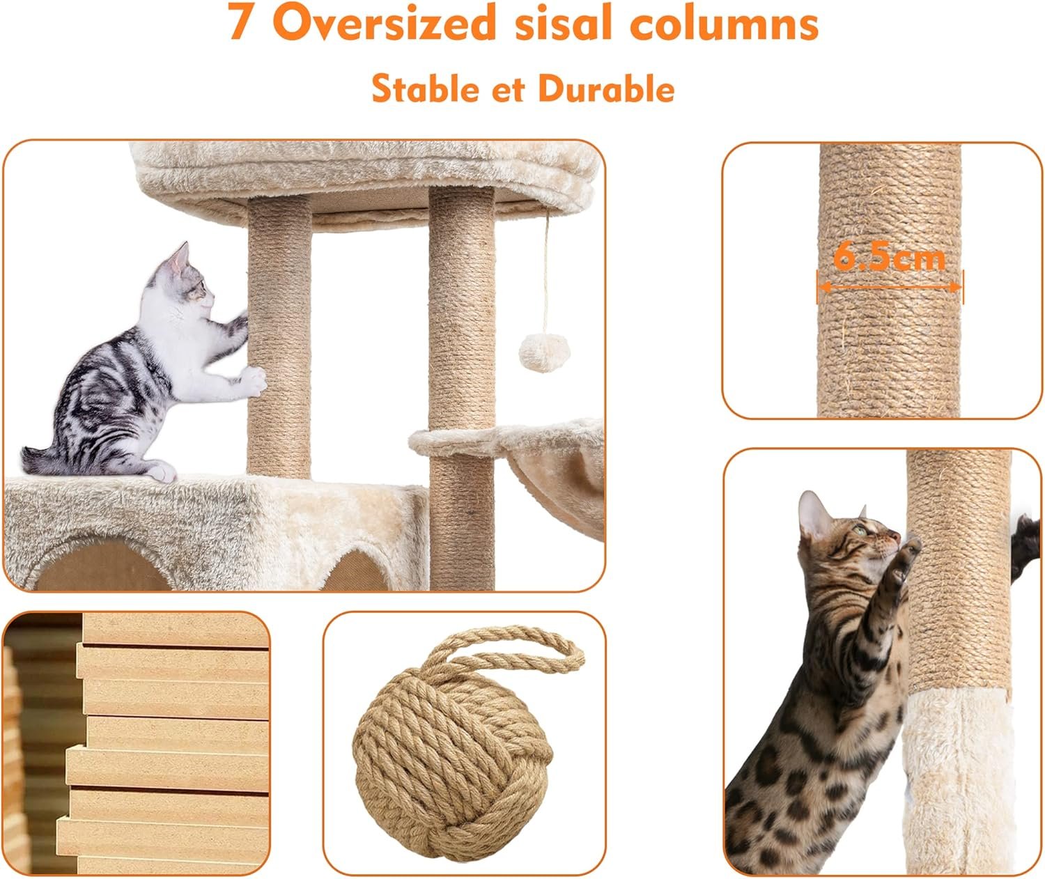 - 【Structure robuste et stable】Une structure multiplateforme solide conçue spécifiquement pour les chats, avec des poteaux en sisal de 7 cm d’épaisseur et une base renforcée, rend l’arbre à grimper pour chats plus stable et ne se renverse toujours pas même lorsque plusieurs chats jouent dessus.