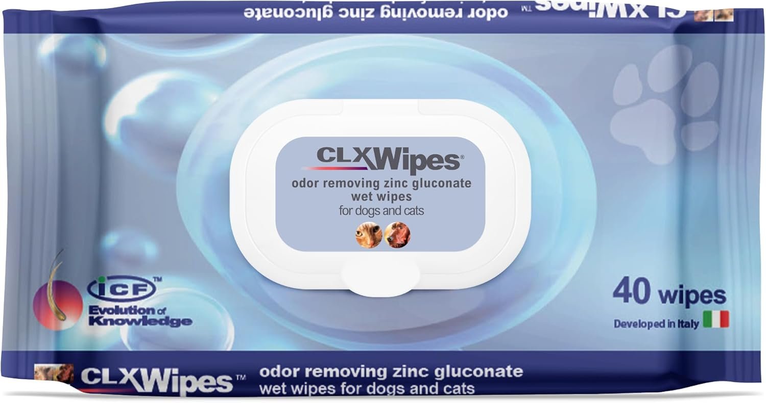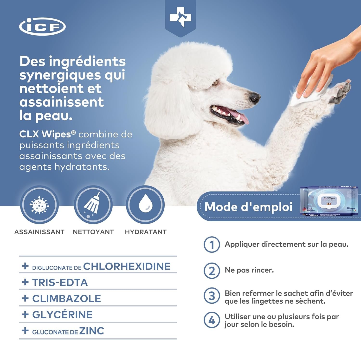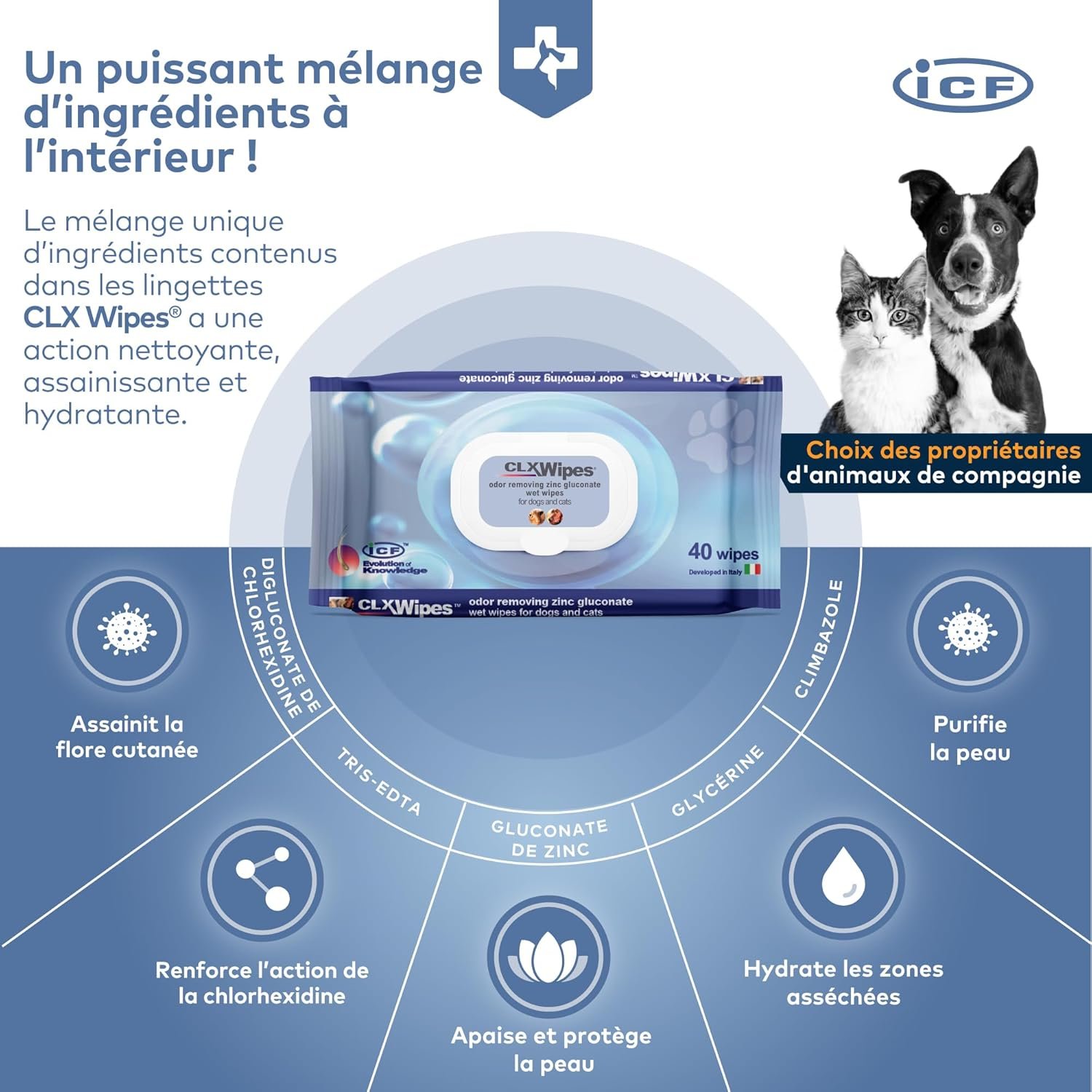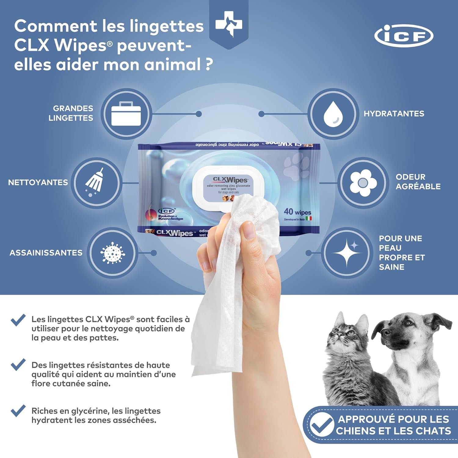 - LINGETTE NETTOYANTE – CLX Wipes permet d’éliminer la saleté, et les mauvaises odeurs tout en hydratant la peau. Les lingettes sont idéales pour un nettoyage quotidien des pattes, espaces interdigités et également des plis de la peau, particulièrement présents chez les races à nez plat tels que les Bouledogues français, Carlins, Boxers et Shih Tzus.