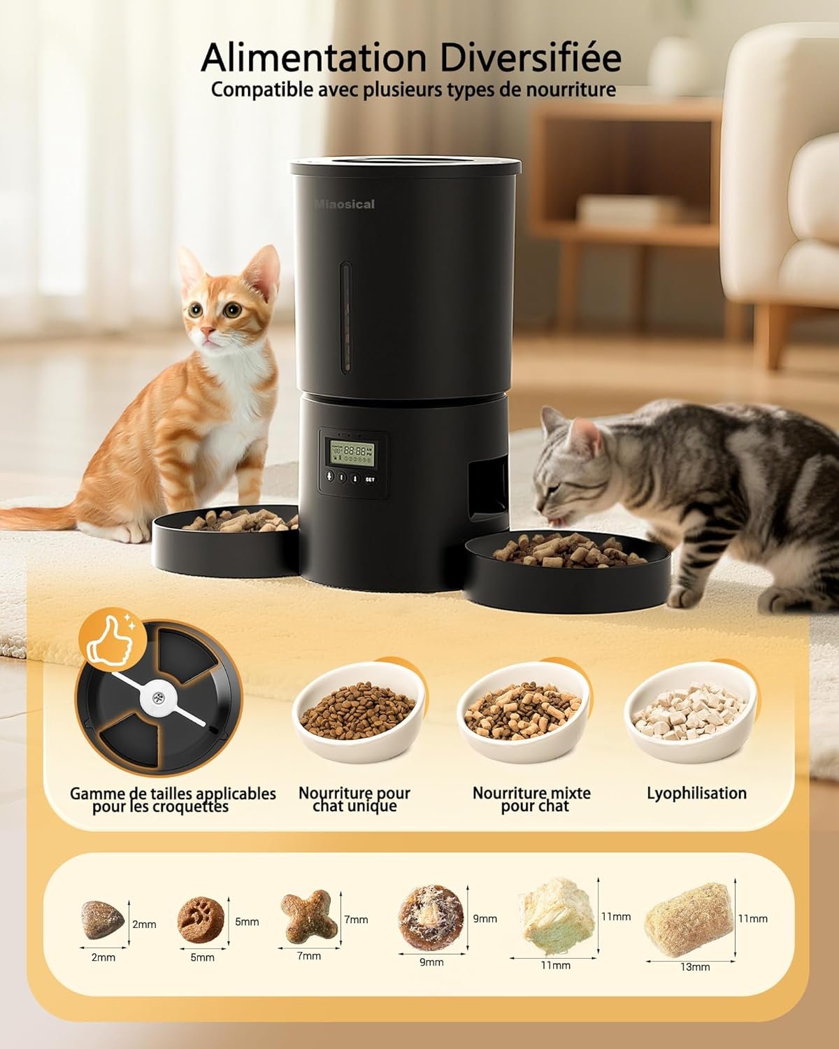 - Alimentation double chat: Le distributeur automatique chat Miaosical dispose d’un timer flexible. Nourrissez 2 chats simultanément avec 6 repas/jour maximum et 12 portions/repas. Chaque portion de croquettes ≈6g ±2g.