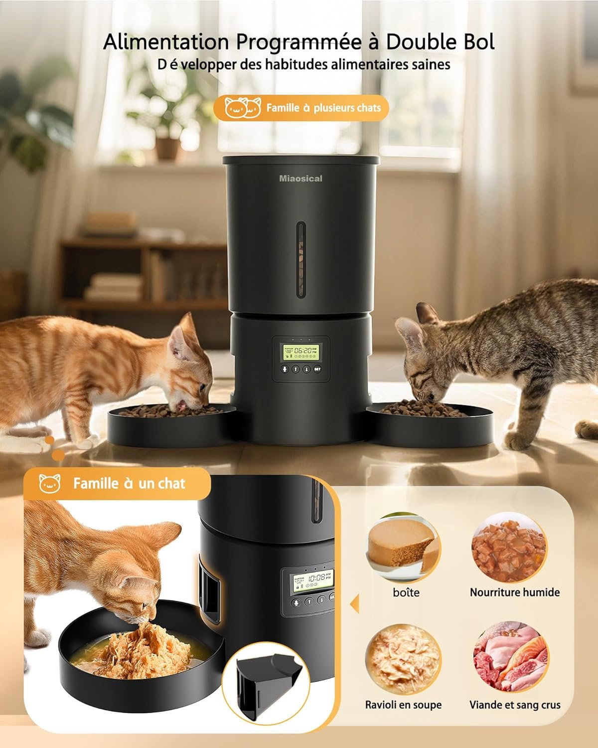 - Conviviale multi-chats: Avec deux bols opposés et réservoir de croquettes chat de 4.2L, ce distributeur de croquettes chat favorise une cohabitation harmonieuse. Fonction message vocal (10s) : votre voix appelle vos chats aux repas.